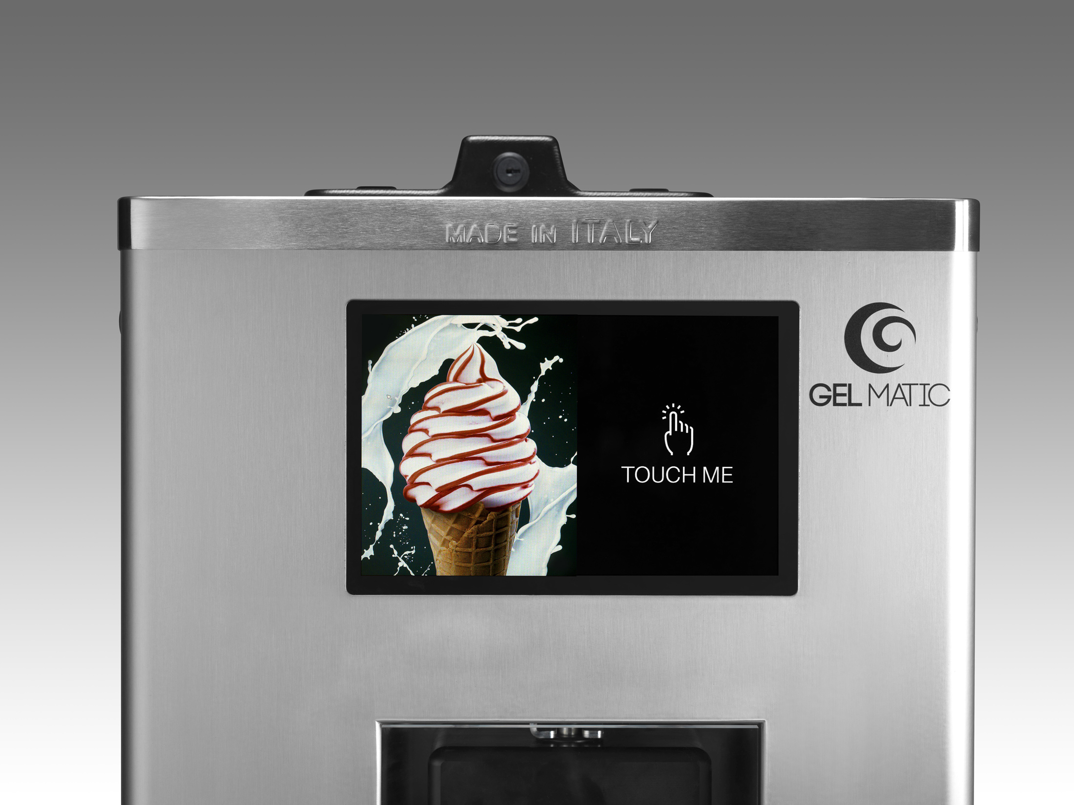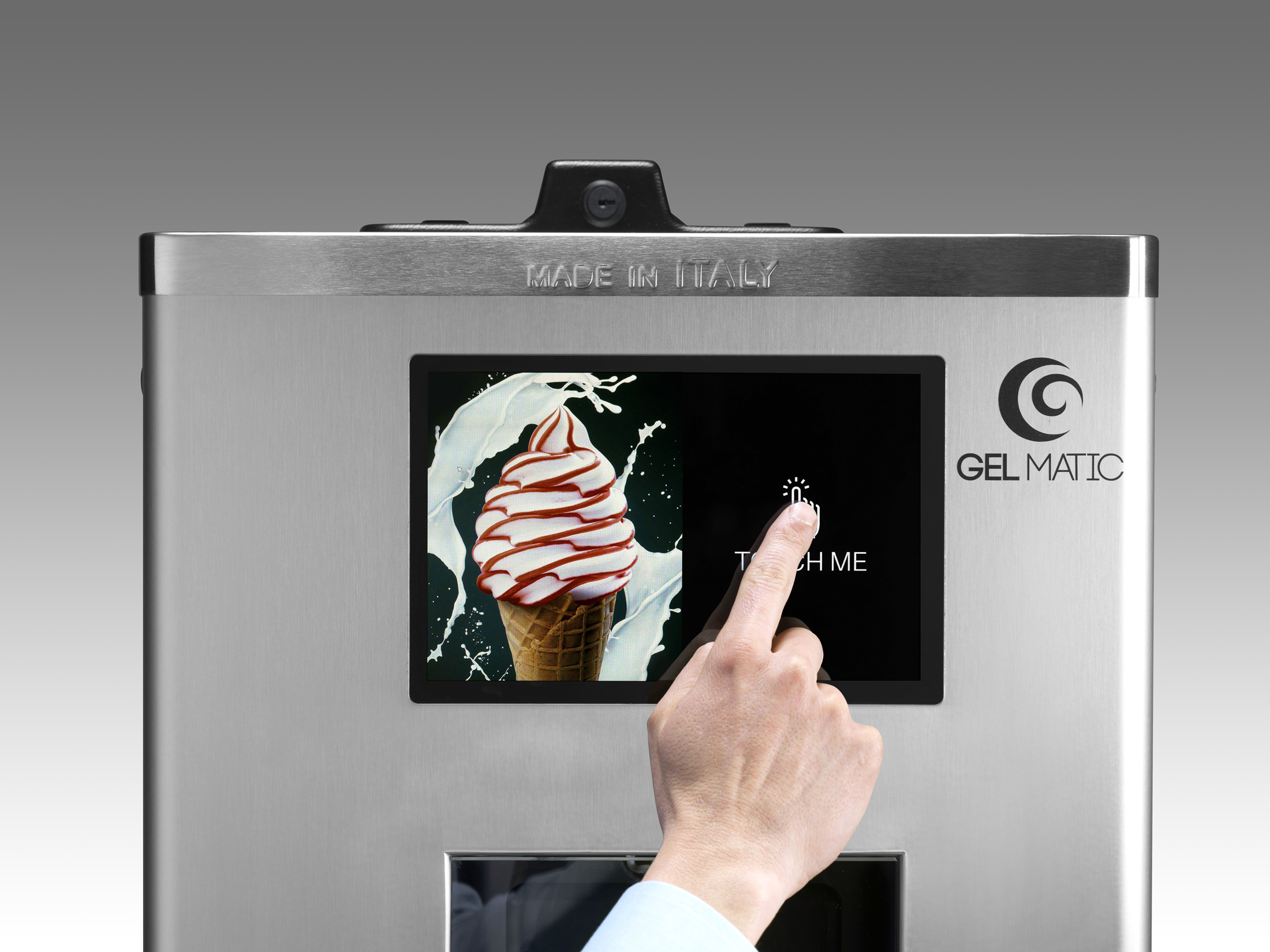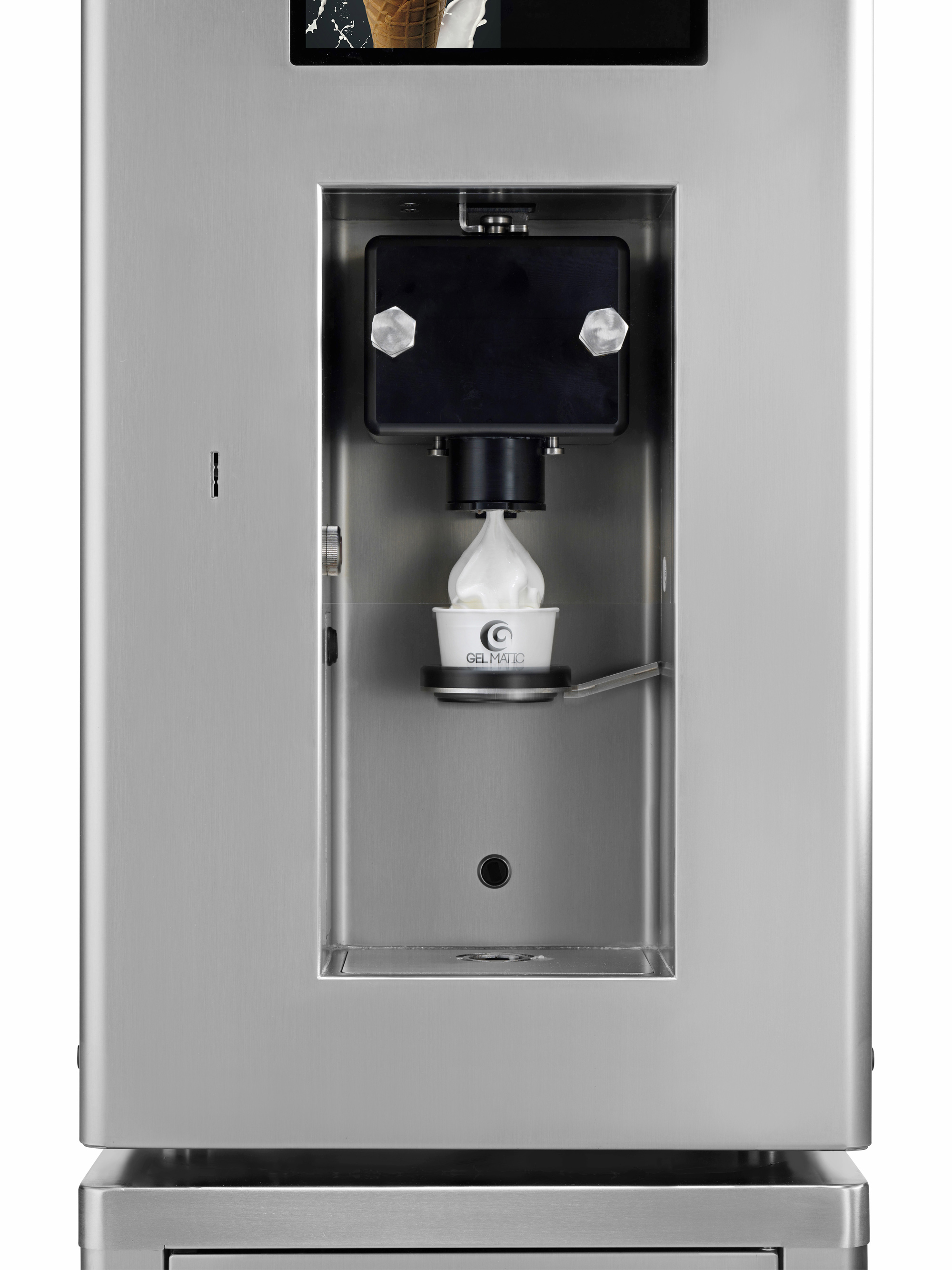 Das Farbige 10,1 Zoll Display der Softeis Selbstbedienungsmaschine kann individuell angepasst werden, genauso wie die äußere Erscheinung des Eisautomaten (Branding).