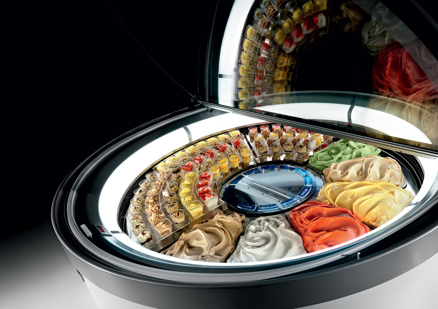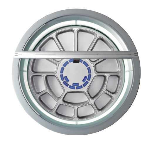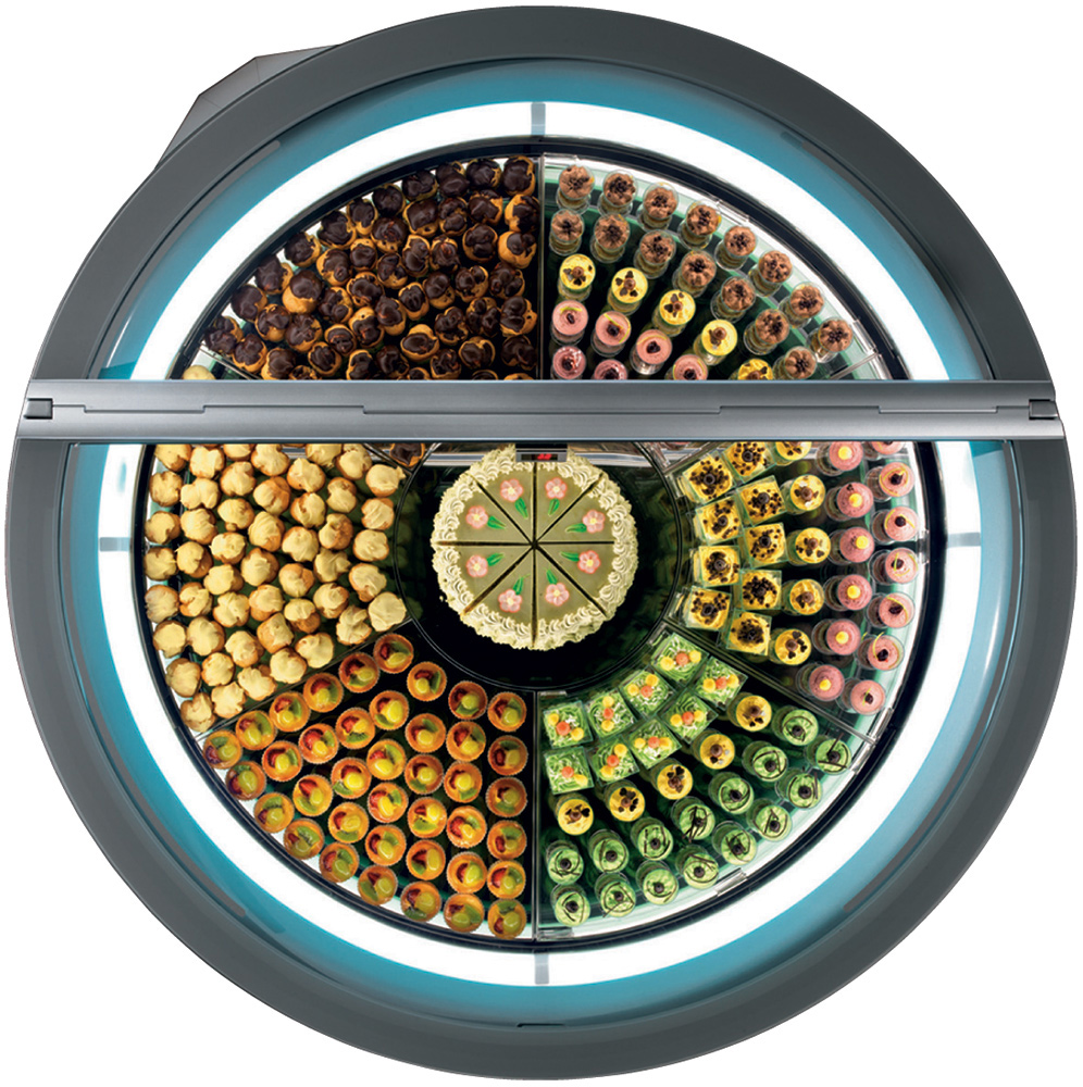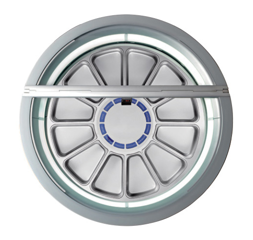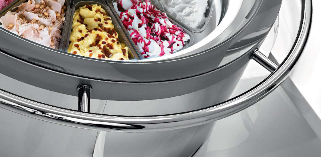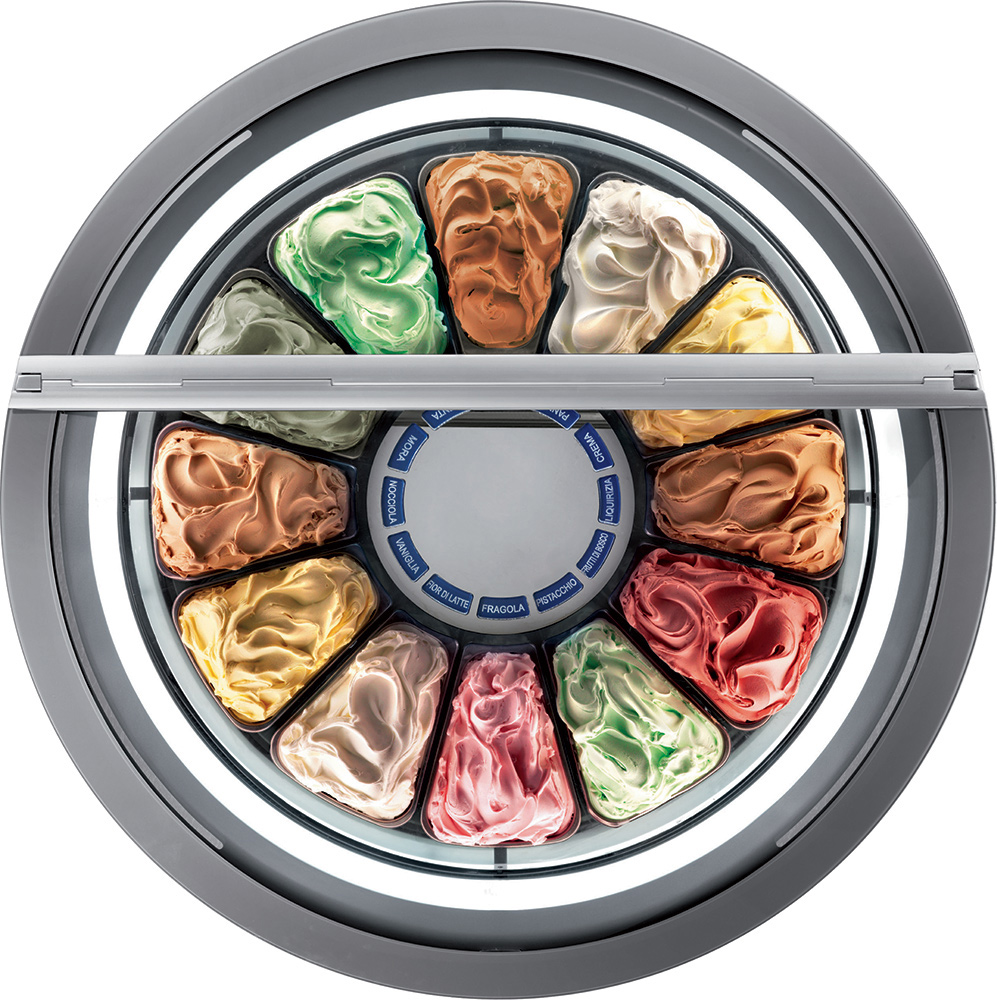 - Die kreisförmige Bewegung der Wannen, die hermetische Schließung und das moderne Umluftsystem gewährleisten eine gleichmäßige Temperaturverteilung zwischen den Wannen, daher braucht der Eisverkäufer die Sorten nicht mehr nach unterschiedlichen Temperaturbereichen anzuordnen.