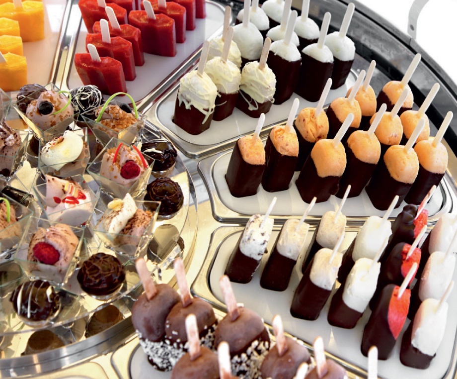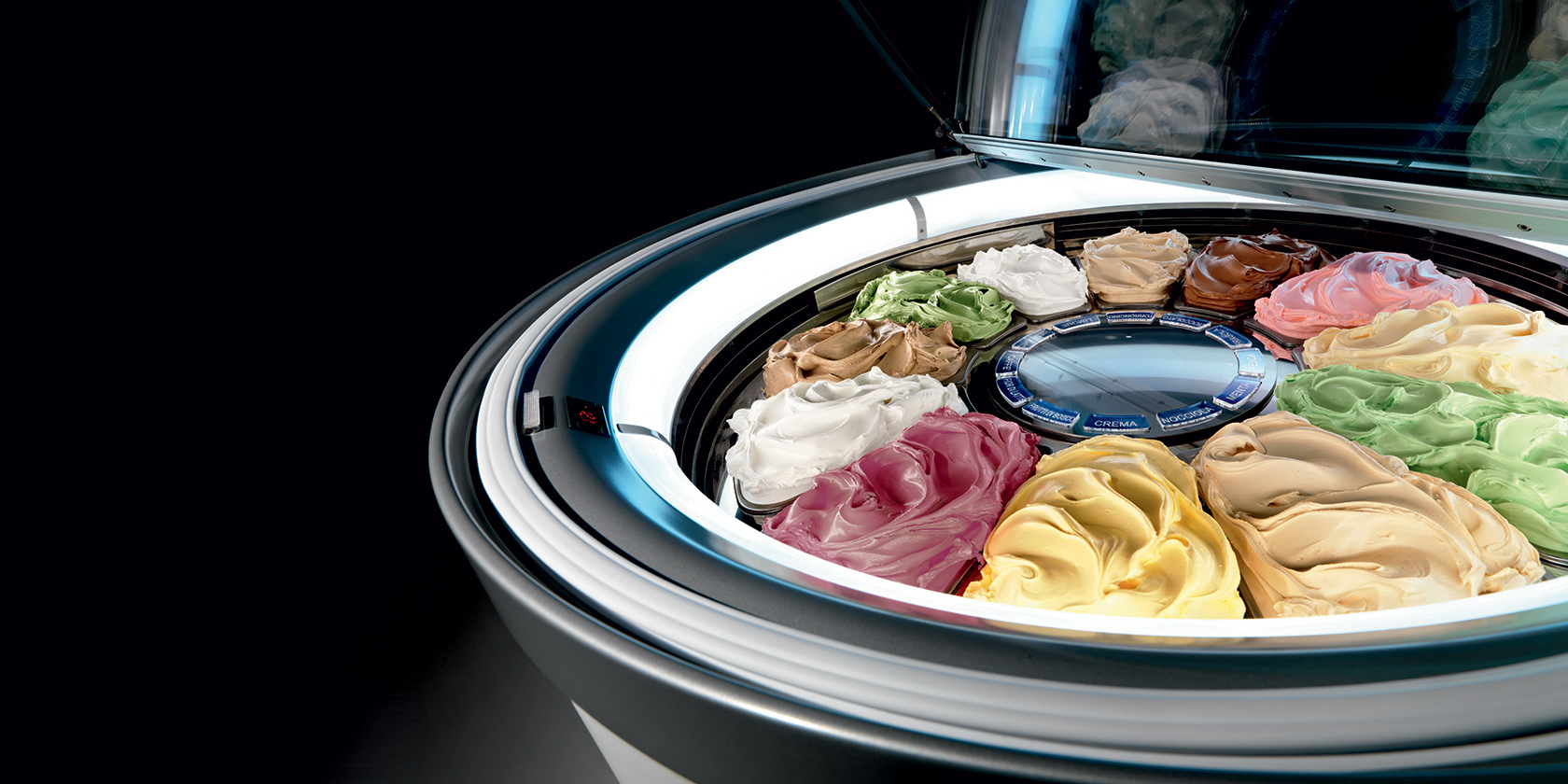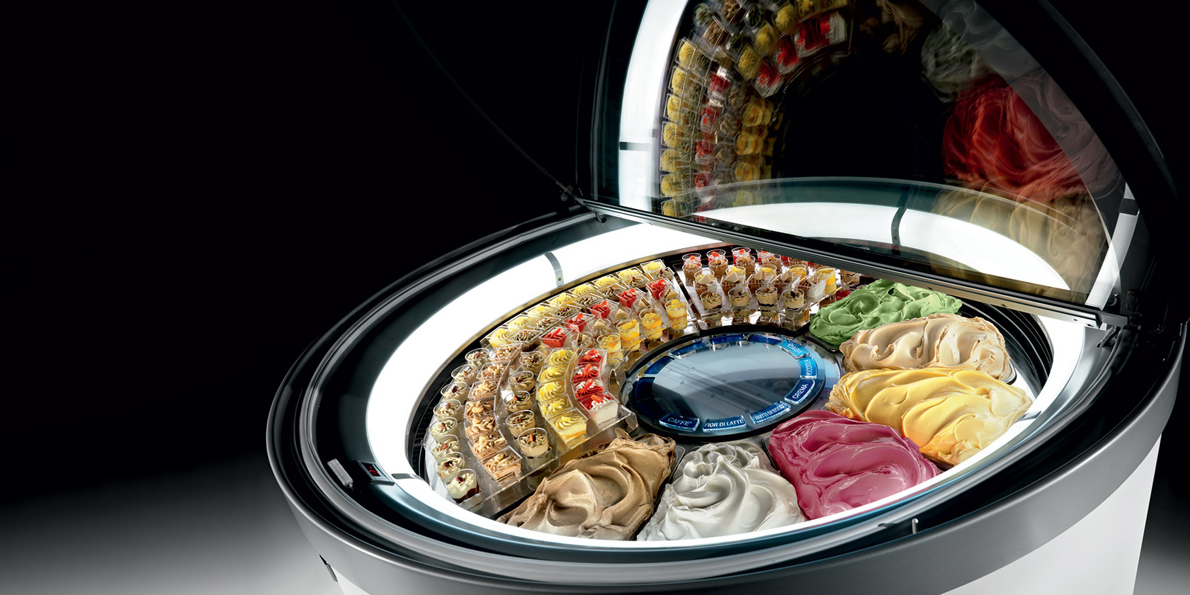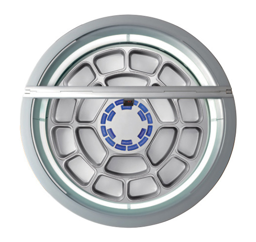 - Die kreisförmige Bewegung der Wannen, die hermetische Schließung und das moderne Umluftsystem gewährleisten eine gleichmäßige Temperaturverteilung zwischen den Wannen, daher braucht der Eisverkäufer die Sorten nicht mehr nach unterschiedlichen Temperaturbereichen anzuordnen.